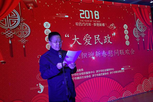 国施善政播仁爱,助寡扶孤沐春晖。为让济宁市市社会福利中心的“三无”老人和孤残儿童过一个祥和快乐的春节,由济宁市民政局主办,济宁市社会组织服务中心和济宁市社会福利中心承办的“大爱民政”2018社会组织迎新春慰问联欢会,于2月9日下午在市社会组织福利中心举行。市民政局党组书记、局长任广德出席并致辞,市民政局副局长闫永,市关工委常务副主任王彦明,市关工委副主任张云沐,市妇联副主席张玲利,市文联副主席李君,市老龄办副主任李长青,市残联副理事长王若迅,市孔孟书画院院长郑志群,团市委宣传部部长庄亚楠,市慈善总会办公室主任殷令喜等出席。